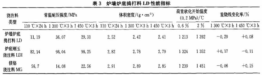 爐墻出現變形,中間縮窄,底部變寬,容易出現開裂:爐底出現大量的氧化鐵渣堆積,影響生產。其所用澆注料、搗打料的性能如下表: