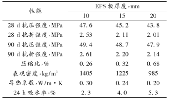 隨著EPS板厚度的增大,輕骨料混凝土復(fù)合隔熱磚抗壓強(qiáng)度、抗折強(qiáng)度降低,壓縮比增大,表觀密度,導(dǎo)熱系數(shù)降低,24h吸水率增大。EPS板的厚度宜控制在15-20mm范圍。