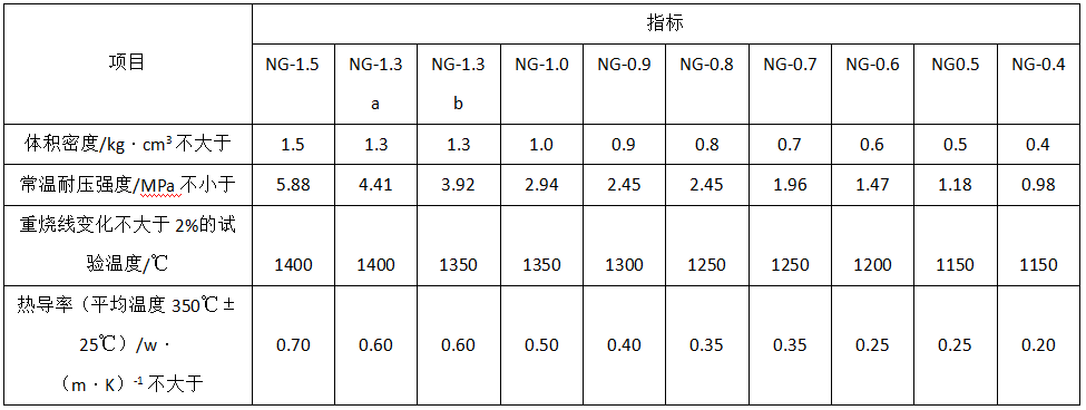 中國標準將粘土質隔熱磚按體積密度分為NG-1.5,NG-1.3a、NG-1.3b、NG-1.0、NG-0.9、NG-O.8,NG-O. 7、NG-O.6、NG-0.5、NG-O.4 10 種牌號,其物理指標和尺寸允許偏差見表1-1和表1-2。