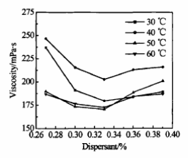 同時可以看出,在堿性條件下(料漿PH=9),30、40℃時分散劑對料漿粘度的影響較大,而50,60℃時分散劑對料漿粘度的影響較小,曲線較為平緩,表明高溫下由于聚合作用的發生,分散劑的作用明顯減小。