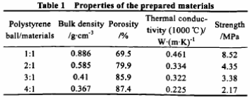 表1是不同球料比(聚苯乙烯球的體積與粉料質量之比,mL·g-1)下所得到的制品的性能。
