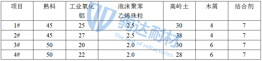 按表1中的配方進行配料。配料時,按比例將熟料工業氧化鋁、高嶺土加入攪拌池內干混2~3min,然后加入添加物和結合劑(外加),邊加入邊攪拌,混勻后困料24h。