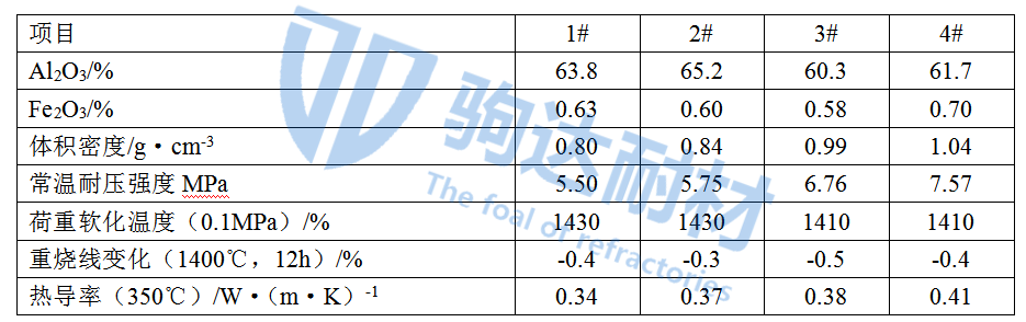 對生產的輕質莫來石磚成品進行外觀質量檢查和理化性能測試,其外觀顏色較白棱角分明,尺寸較明確,表面無微裂紋。其理化性能見表-2
