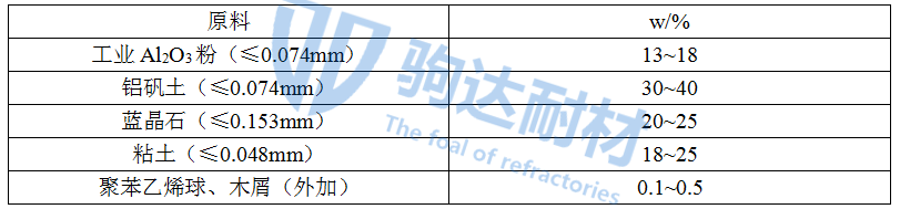 以工業Al2O3粉、粘土、燒結良好的鋁礬土和部分藍晶石為主要原料,添加木屑(1mm篩選)和聚苯乙烯球(直徑2~0.5mm)制備輕質磚。原來化學組成見表1。