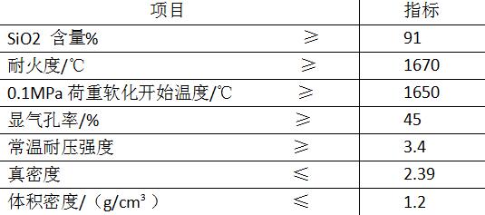 輕質硅磚的礦物組成為:磷石英78%〜86%,方石英78%〜86%,石英78%〜86%。一般輕質硅磚的耐壓強度2.0〜9.5MPa,熱導率0.35〜0.42W/(m·K)。輕質硅磚具有優良的耐火性能,荷重軟化溫度接近致密硅磚達到1620℃以上,僅有少量的殘余膨脹,并且其熱穩定性能比致密硅磚好。因此,輕質硅磚可在不與熔渣接觸的高溫條件下1500〜1550℃長期使用。下圖列出了我國工業窯爐用輕質硅磚的技術條件。