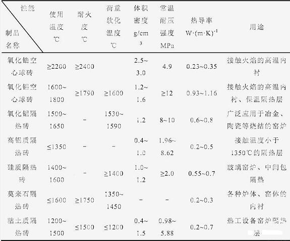 表1是一些常見(jiàn)的高溫隔熱磚性能及用途。由表可知,不同材質(zhì)的保溫隔熱耐火材料有不同的使用溫度及性能特點(diǎn),并最終決定其用途。氧化鋁空心球磚具有良好的保溫性能的同時(shí),還具有使用溫度高、荷重軟化點(diǎn)高、耐壓強(qiáng)度高等特點(diǎn),不但可以做隔熱層,還可以與火焰直接接觸。氧化鋯空心球磚雖比氧化鋁空心球磚具有更好的隔熱性能和更高的使用溫度,但是氧化鋯空心球制品價(jià)格高昂、原料儲(chǔ)量有限,一般只用于一些特殊要求的窯爐;而氧化鋁空心球制品則由于氧化鋁原料豐富,性價(jià)比高,是當(dāng)前最受歡迎的高溫、高強(qiáng)輕質(zhì)隔熱材料。氧化鋁隔熱磚使用溫度雖然比空心球制品低,但其體積密度比空心球制品低很多,因此熱導(dǎo)率更小,保溫隔熱性能也更好。氧化鋁隔熱磚廣泛應(yīng)用于冶金、陶瓷等燒結(jié)窯爐的保溫,不能承受荷重,要避免直接暴露在具有強(qiáng)烈沖刷、磨損和侵蝕的環(huán)境中。根據(jù)氧化鋁的含量的差異鋁硅系的輕質(zhì)隔熱材料主要分為高鋁隔熱磚、莫來(lái)石隔熱磚、黏土質(zhì)隔熱磚和硅質(zhì)隔熱磚,由于這類(lèi)制品具有較好的隔熱性能,使用溫度又可在較大范圍內(nèi)調(diào)整,適用各種工業(yè)窯爐在一般使用條件(不含金屬溶液或熔渣接觸,無(wú)劇烈熱震蕩,無(wú)化學(xué)反應(yīng),不受侵蝕,不受劇烈的機(jī)械沖撞、磨損等)下的保溫隔熱,可直接接觸火焰,更多的作為中間保溫隔熱層使用,例如黑色冶金行業(yè)的帶式燒結(jié)機(jī)、球團(tuán)焙燒爐、煉鋼與軋鋼加熱爐的保溫隔熱,有色金屬冶煉的鋁電解槽、鋁熔煉爐、煉鋅電熱蒸餾爐及精餾設(shè)備的保溫隔熱,建材行業(yè)(陶瓷、玻璃、水泥)和石化與化工行業(yè)的催化裂化裝置、合成氨裝置的一段、變換爐、二段轉(zhuǎn)化爐的保溫,以及余熱鍋爐、垃圾焚燒爐、炭素焙燒窯和各種用途的電阻爐等的保溫隔熱,鋁硅系保溫隔熱材料是目前熱工窯爐應(yīng)用最多的保溫隔熱材料。